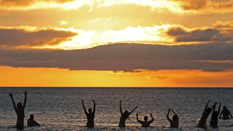 In one scene, a nude woman rides horseback on a man, while in another, a naked woman crawls over three nude men lying next to each other in the sand.