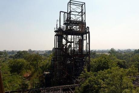 The plant sits abandoned behind walls, crawling with vines, weeds and snakes. E-610, the now rusting tank from which the poison sprang, is still identifiable by its fading serial number.
