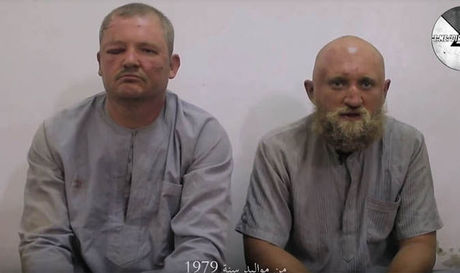 Two handcuffed men were shown in a video distributed by IS' Amaq news agency on Tuesday sitting in gray robes against a wall. One appeared to have bruises on his face.