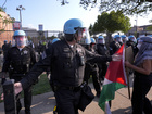 Dozens of protesters broke through a security fence near the site of the Democratic National Convention on its opening day Monday as thousands took to the streets to voice their opposition to the war in Gaza.