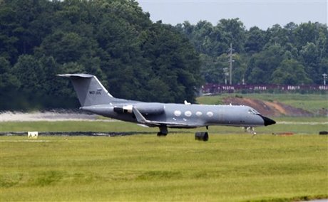 Footage of the arrival filmed from long-distance showed the jet pulling up at an aircraft hangar where it was met by an ambulance and several vehicles.