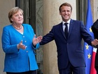 French President Emmanuel Macron met with German Chancellor Angela Merkel in Paris Thursday to discuss international crises and European issues, days before elections that will determine who succeeds her after 16 years in office.